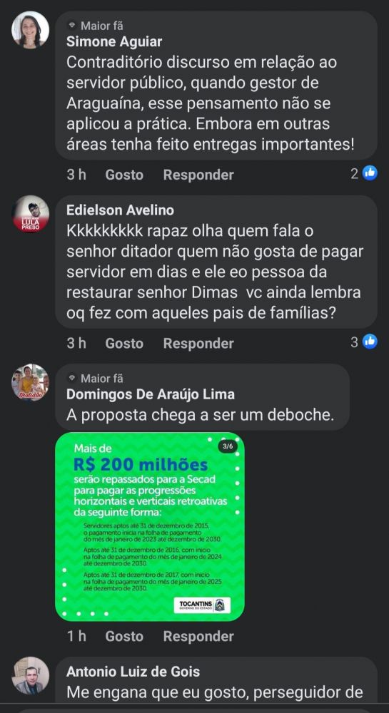 Não demorou para Dimas ser questiono, criticado e desmentido nas redes sociais. Considerado um dos piores gestores para os servidores de Araguaína, na suas duas gestões Dimas enfrentou diversas manifestações, protestos e greves da classe que reivindicavam respeito aos seus direitos.