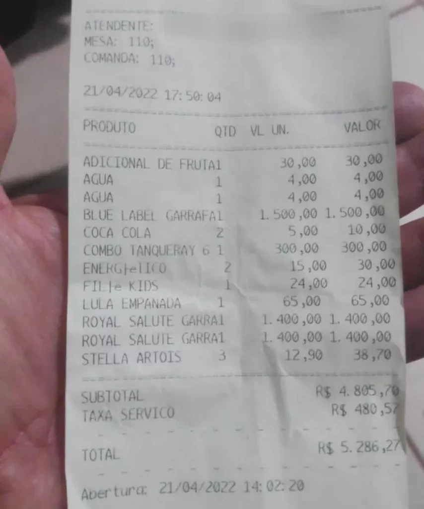 A comanda de Ruan Pamponet Costa, preso nesta quinta-feira, 21, por dar um golpe de R$ 5,2 mil no bar e restaurante de Palmas, Dona Maria Beach, era composta principalmente de bebidas de alto valor. Entre os itens estão energéticos, três garrafas de whisky, combo de gin e uma porção de lula empanada. Segundo o estabelecimento, ele dividiu os itens com outras pessoas que estavam no local, mas se recusou a pagar a conta.