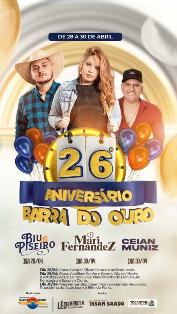 Barra do Ouro completou 26 anos de emancipação política nesta última terça-feira, 26, e a Prefeitura de Barra do Ouro está organizando as festividades em comemoração ao aniversário do Município, que ocorrerão de 28 a 30 de abril, nas proximidades da Praça Nemésio Mendes de Miranda, no centro da cidade. Os cantores Mari Fernandez, Ceian Muniz e Biu do Piseiro são as principais atrações da festa, que terá ainda apresentações dos artistas da terra, shows gospels, além de ações sociais e atividades esportivas.