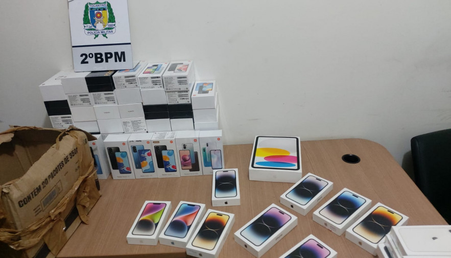 Ao proceder com abordagem, busca veicular e busca pessoal nos acusados, foram localizados de posse dos suspeitos noventa e cinco celulares, um IPad e R$ 2.201,25 (Dois mil e duzentos e um reais e vinte e cinco centavos) em espécie. Sobre o fato, o homem de 34 anos, relatou que havia comprado os equipamentos, porém, não possuía nota fiscal.