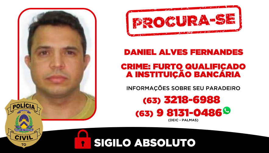 A Polícia Civil do Tocantins está à procura de Daniel Alves Fernandes, 35 anos, apontado como um dos integrantes do trio criminoso especializado em arrombamentos a caixas eletrônicos, que é alvo da Operação Payback, deflagrada no último dia 10, para dar cumprimento a mandados de prisão e de busca e apreensão nas cidades de Fortaleza e Novo Oriente, ambas no Ceará. Quem tiver informações sobre o paradeiro de Daniel, basta acionar a Divisão Especializada de Repressão ao Crime Organizado (DEIC – Palmas) por meio do telefone/WhatsApp (63) 63 8131-0486 ou (63) 3218-6988. O anonimato é garantido.