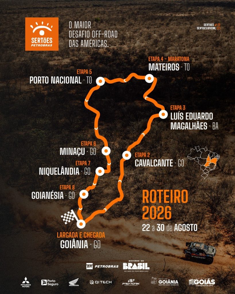 A competição de 2026 terá largada em Goiânia (GO) e seguirá por Cavalcante (GO), Luís Eduardo Magalhães (BA), Mateiros (TO), chegando então a Porto Nacional (TO), que será sede da quinta etapa do rally. Depois, o percurso continua por Minaçu (GO), Niquelândia (GO), Goianésia (GO), com encerramento novamente na capital goiana. Reconhecido como o maior rally das Américas, o Sertões desafia pilotos e equipes em trajetos intensos, com terrenos variados que vão desde o cerrado até regiões de difícil acesso, exigindo preparo técnico e físico de alto nível. A chegada dos competidores em Porto Nacional é na quarta-feira, 26 de agosto. No dia seguinte, eles partem em direção a Minaçu (GO).