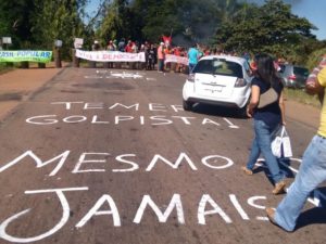 Nas faixas usadas durante o ato, eles cobram reforma agrária e manifestam apoio ao governo da presidente Dilma Rousseff, dizendo que “não vai ter golpe”. No local, sete policiais rodoviários federais tentam negociar o desbloqueio da rodovia.