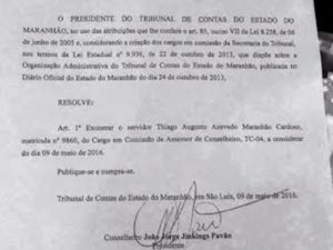 O Tribunal de Contas do Estado do Maranhão (TCE-MA) exonerou nesta segunda-feira (9) o funcionário Thiago Augusto Azevedo Maranhão Cardoso, filho do presidente interino da Câmara dos Deputados, Waldir Maranhão (PP-MA).