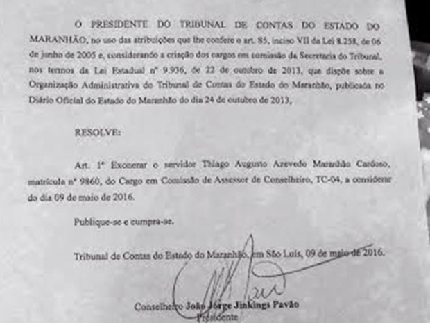 O pedido de exoneração partiu do conselheiro Edmar Serra Cutrim e foi assinado pelo presidente do TCE-MA, João Jorge Jinkings Pavão, após uma denúncia do jornal “Folha de S.Paulo” de que Thiago Maranhão Cardoso estaria atuando como médico em São Paulo e fazendo pós-graduação na mesma cidade enquanto exercia uma função comissionada de expediente diário em São Luís.