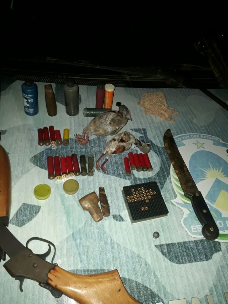 Uma equipe do Batalhão de Polícia Militar Ambiental (BPMA) prendeu na sexta-feira, 05, nos trilhos da Ferrovia Norte Sul, próximo ao Pontilhão do Lago do Estreito, município de Aguiarnópolis, dois indivíduos suspeitos de porte ilegal de arma de fogo e transporte ilegal de espécimes da fauna sem autorização. Com a dupla os policiais apreenderam duas armas de fogo de fabricação artesanal, calibres 28 e 36, quatro aves silvestres abatidas, apitos para chamar aves ou animais, porções de pólvora negra e chumbo, capsulas de munições intactas e deflagradas.