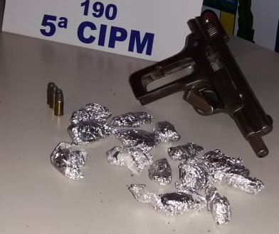 Durante busca pessoal os militares localizaram com um dos suspeitos, 14 papelotes de uma substância entorpecente aparentando ser maconha prensada, pronta para ser consumida. Já com o outro indivíduo foi localizada uma arma de fogo calibre 32 com quatro munições intactas. Além da ameaça à vítima, os criminosos danificaram a porta direita de seu veículo.