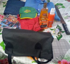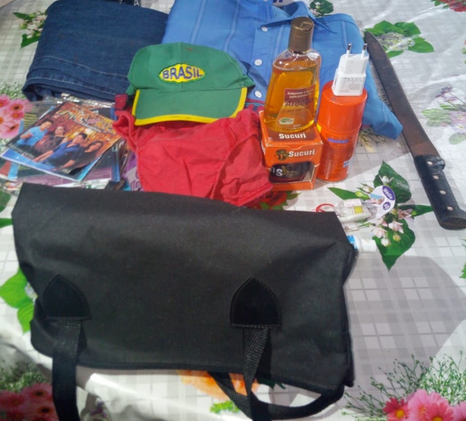 Com o suspeito, a PM apreendeu uma arma branca, tipo facão, e diversos objetos furtados, como roupas, 21 DVD’s e vários outros produtos. Em seguida, a vítima foi localizada e informou que para a prática do crime o autor danificou uma das janelas da casa para adentrar.