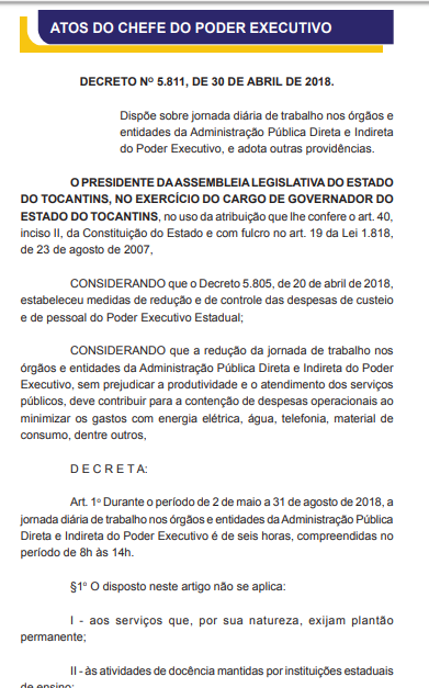 O Governo do Tocantins publicou nesta segunda-feira, 30, um decreto para reduzir a jornada de trabalho dos servidores públicos do estado de oito para seis horas diárias. A medida começa a valer já na quarta-feira, 2, e será das 8h às 14h.