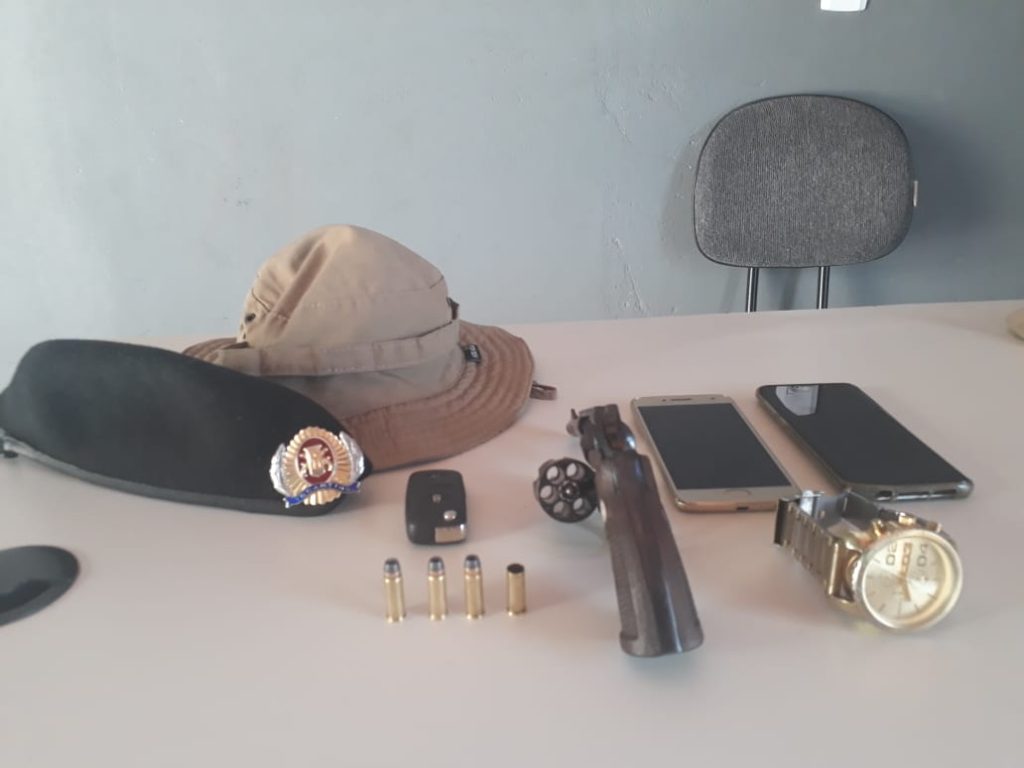 Após serem acionados devido a uma denúncia de que havia um homem, em um bar, exibindo uma arma de fogo, os policiais militares foram até o local onde avistaram o suspeito dentro de um veículo. Na abordagem foi encontrado um revólver calibre 32 com três munições intactas e uma deflagrada.