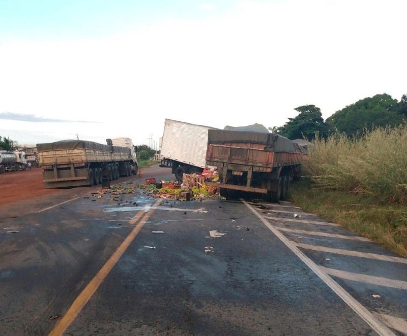A suspeita é que um dos caminhões saia de um posto de combustíveis e se chocou com o outro veículo que trafegava na BR.