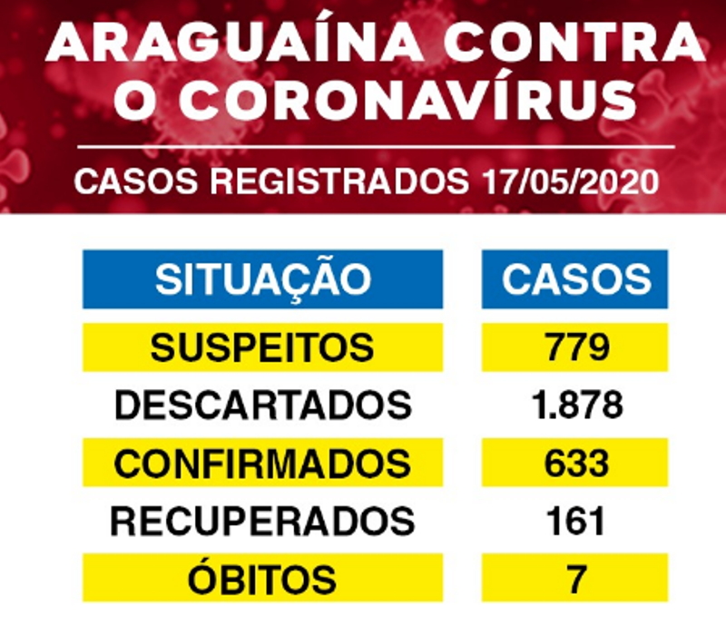 A Secretaria Municipal de Saúde de Araguaína, norte do Tocantins, divulgou nesta segunda-feira, 18, que o município registrou mais 53 confirmações para covid-19. Vinte mulheres e trinta e três homens. Com esses, o Município chega a 633 casos confirmados do novo coronavírus, 161 recuperados e 7 óbitos.
