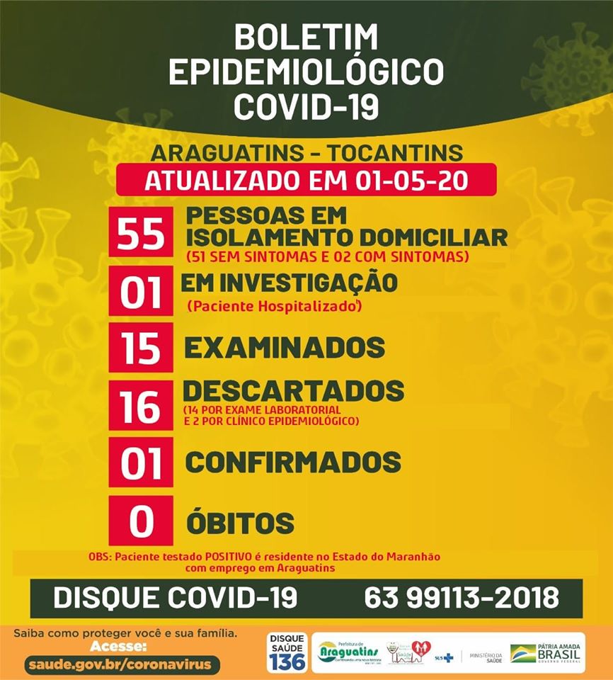 O Município de Araguatins confirmou o 1° caso do novo coronavírus por meio de exame “RT-PCR”, realizado pelo Laboratório Central de Saúde Pública do Tocantins em Palmas – LACEN/TO, liberado no dia de hoje, às 18h. Trata-se de um paciente do sexo masculino, 28 anos, sem comorbidades, residente no Estado do Maranhão e presta serviço na cidade frequentemente, e encontra-se em isolamento domiciliar, seguindo protocolos e recomendações para manejo clínico, apresentando sintomas respiratórios leves.