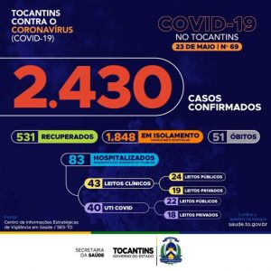 Atualmente, o Tocantins apresenta 2.430 casos no total, destes, 531 pacientes estão recuperados, 1.848 pacientes estão ainda em isolamento domiciliar ou hospitalar e 51 pacientes foram a óbito.
