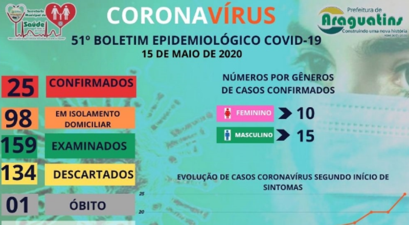 A Prefeitura de Araguatins, no norte do Tocantins, divulgou nesta sexta-feira, 15, o boletim epidemiológico que apresentou 25 (vinte e cinco) casos confirmados do novo coronavírus.