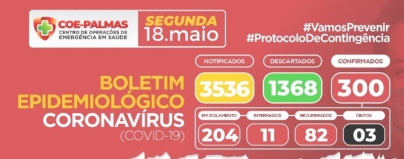 Com isso, Palmas totaliza agora 300 casos confirmados de Coronavírus. O Centro de Operações de Emergência em Saúde (COE Palmas Covid-19) informou também que 82 pessoas estão recuperadas da doença e três foram a óbito na Capital.