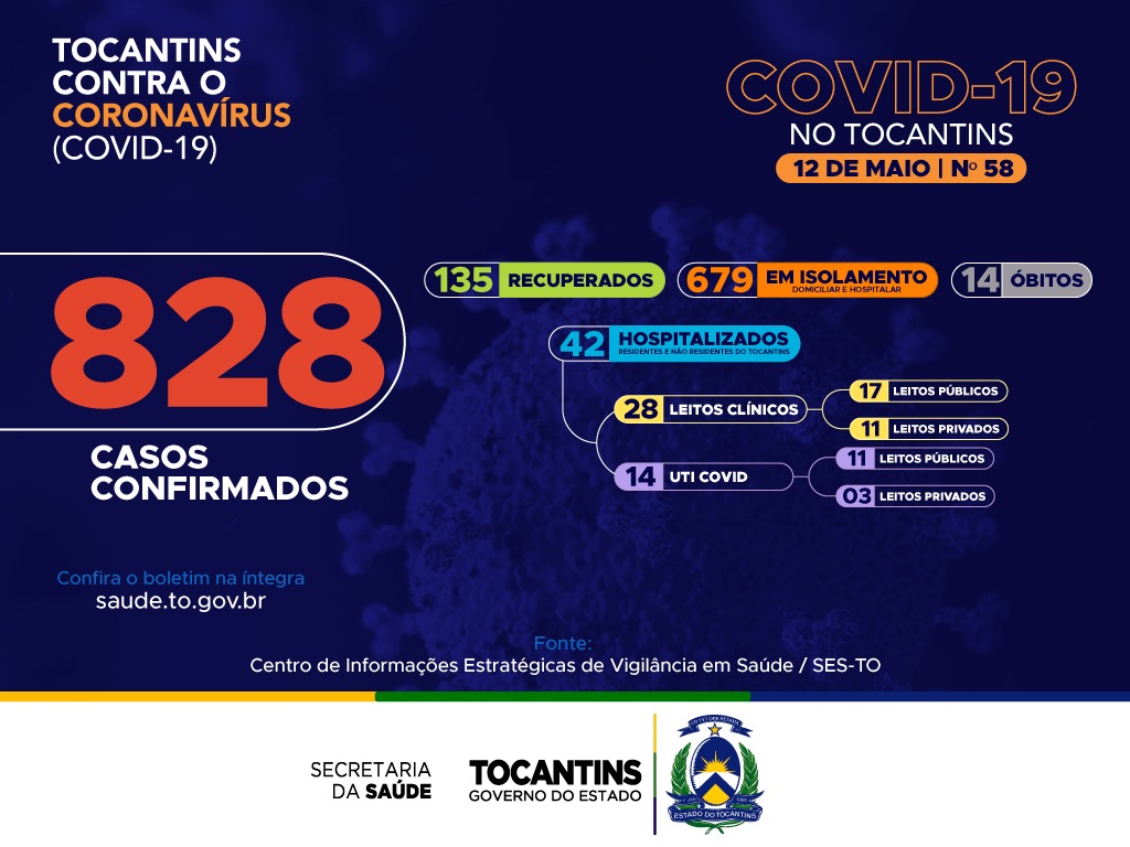 Atualmente, o Tocantins apresenta 828 casos no total, destes, 135 pacientes estão recuperados, 679 pacientes estão ainda em isolamento domiciliar ou hospitalar e 14 pacientes foram a óbito.