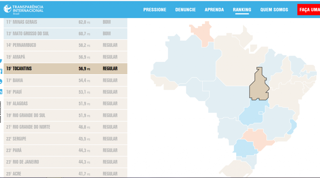 Brasil lançou nesta quinta-feira, 21, o Ranking de Transparência no Combate à COVID-19 para identificar e promover as melhores práticas de transparência de informações referentes às contratações emergenciais realizadas em resposta à COVID-19. O estado do Tocantins, com 56,9 pontos, obteve a 15ª colocação no ranking dentre 26 estados e o Distrito Federal. Com essa pontuação, a mesma do Amapá, a metodologia do ranking classifica as práticas de transparência em contratações emergenciais de ambos os estados como regulares. Também sua capital, Palmas, obteve essa mesma avaliação (regular), com 49,3 pontos.
