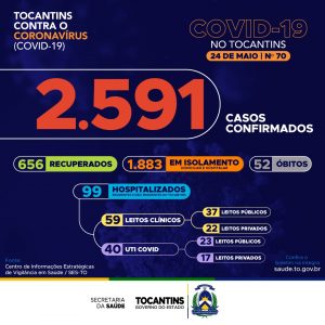 Atualmente, o Tocantins apresenta 2.591 casos no total, destes, 656 pacientes estão recuperados, 1.883 pacientes estão ainda em isolamento domiciliar ou hospitalar e 52 pacientes foram a óbito.