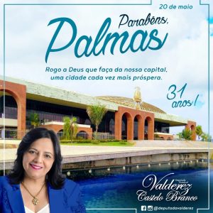 A deputada estadual Valderez Castelo Branco parabenizou nesta quarta-feira, 20, por meio de suas redes sociais, a cidade de Palmas, pela passagem dos seus 31 anos. A parlamentar citou o momento difícil que a Capital e todos os municípios do Tocantins e do Brasil estão passando, devido a Pandemia de Coronavírus, mas destacou que essa situação será vencida por todos.