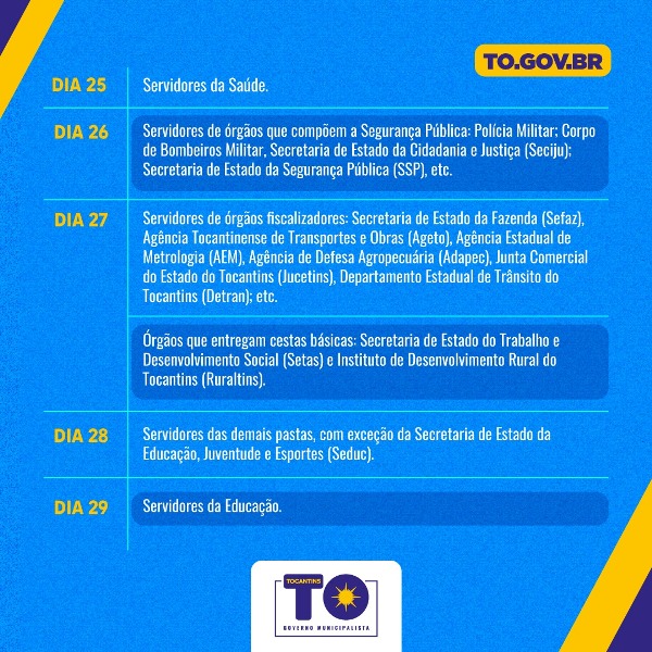 Com investimento de R$ 165.133.047,39, valor líquido da folha referente ao mês de maio, o Governo do Tocantins começa a enviar a ordem de pagamento dos servidores na próxima segunda-feira, 24. Assim, pelo terceiro mês consecutivo, o pagamento está sendo efetuado antecipadamente e de forma escalonada, conforme determinação do governador Mauro Carlesse, cuja preocupação, além de manter os salários em dia, é evitar aglomeração em bancos e comércios do Estado nesse período de pandemia. O dinheiro estará disponível para saque sempre no dia seguinte ao envio da ordem de pagamento.