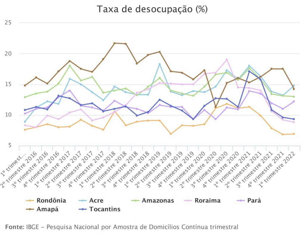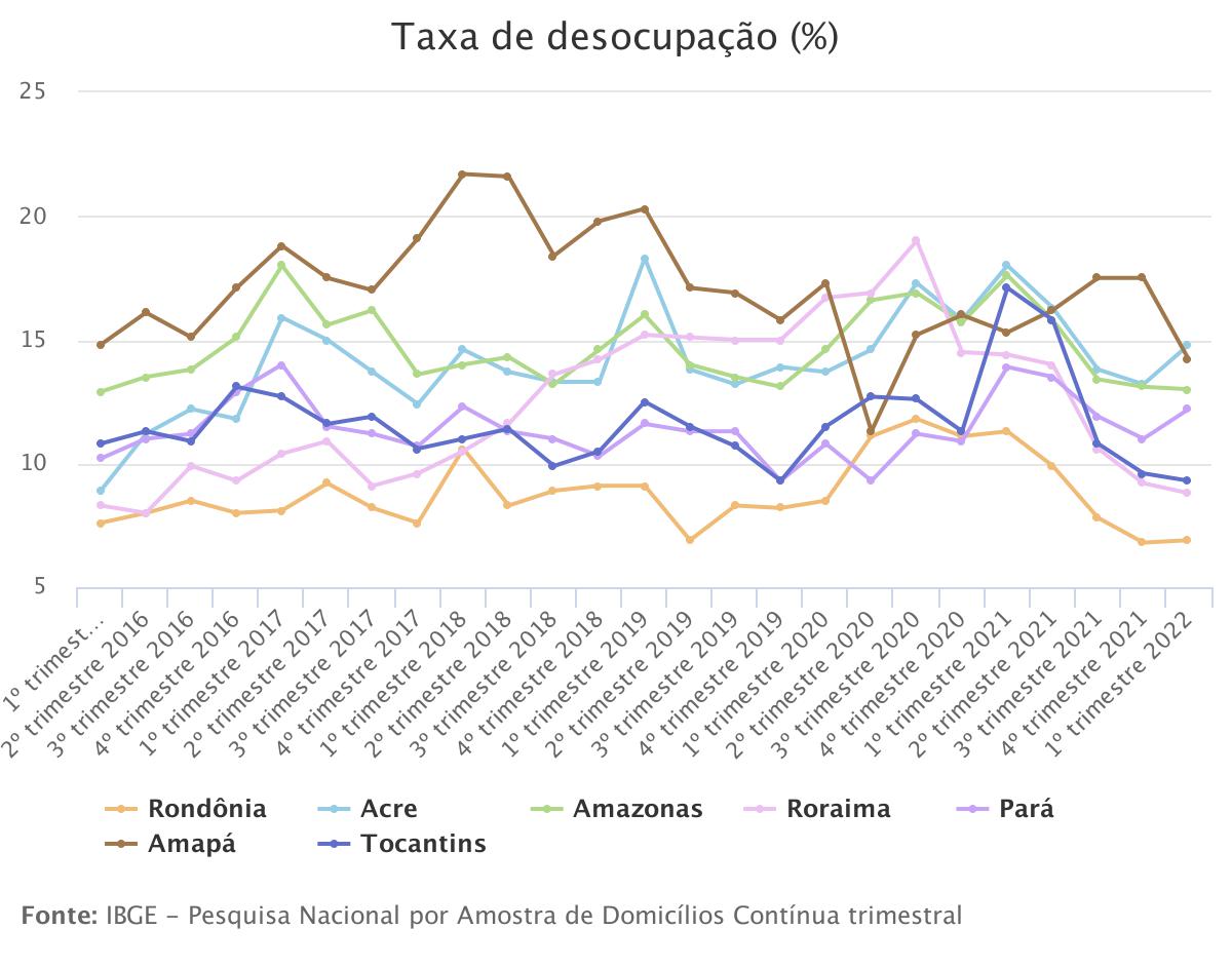 No Amapá, único estado com queda, a taxa recuou 3,3 p.p., passando de 17,5% no quarto trimestre de 2021 para 14,2% no primeiro trimestre deste ano. “Essa queda, contudo, não se deve ao aumento no número de pessoas ocupadas, mas a menor pressão das pessoas sem trabalho buscando ocupação no estado. Houve uma queda de 7,3% no número de pessoas na força de trabalho e um aumento de 10,4% no contingente fora da força”, analisa a coordenadora de Trabalho e Rendimento do IBGE, Adriana Beringuy.