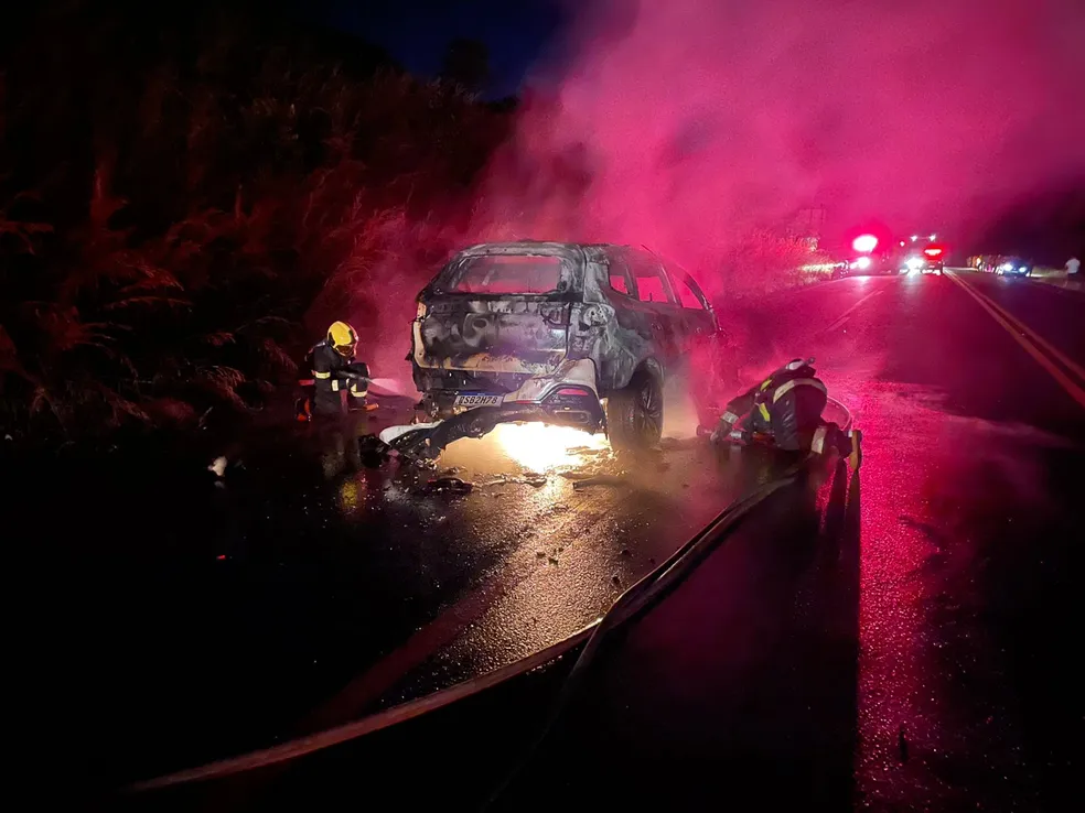 Um carro ficou completamente destruído após pegar fogo na TO-080, em Paraíso do Tocantins, na noite desta sexta-feira (12). Testemunhas informaram aos Bombeiros que o motorista trafegava pela rodovia, quando se chocou contra um boi na pista, o que teria ocasionado o incêndio.