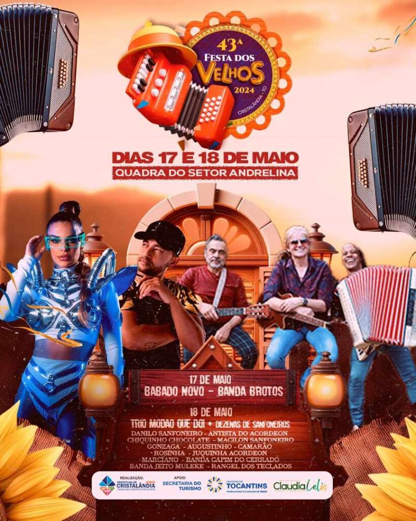 A 43ª Edição da Festa dos Velhos de Cristalândia (na região centro-oeste do TO) já tem data marcada, acontece no próximo dia 18, no mesmo local onde a histórica programação foi iniciada, a Praça do Setor Andrelina. A festividade popular é realizada pela Prefeitura de Cristalândia e neste ano terá a inovação, a abertura, um dia antes (na sexta-feira, 17), com o show da banda baiana Babado Novo.