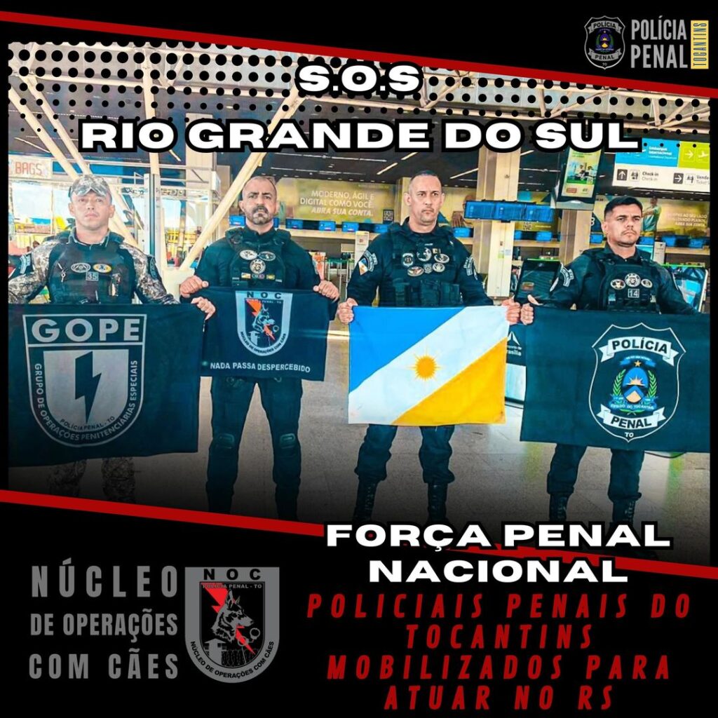 Quatro Policiais Penais Tocantinenses, foram mobilizados pela Força Penal Nacional para atuar nas operações táticas prisionais e em demais operações ao qual forem designados, seja de resgate com emprego de cães ou de apoio a segurança e às vítimas das enchentes no Rio Grande do Sul.