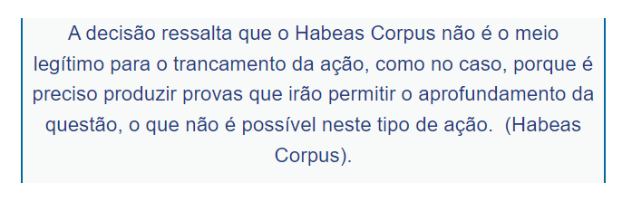 A relatora também ressaltou que na ação penal há “indícios suficientes” da autoria dos crimes e a materialidade (a comprovação da morte) e que o trancamento de uma ação penal por meio de Habeas Corpus é uma medida adotada em casos excepcionais. A medida é aceita quando há ausência de justa causa para a ação, imputação de fato penalmente atípico, incidência de causa que extingue a punibilidade ou se não há qualquer elemento que indique a possível autoria do crime.