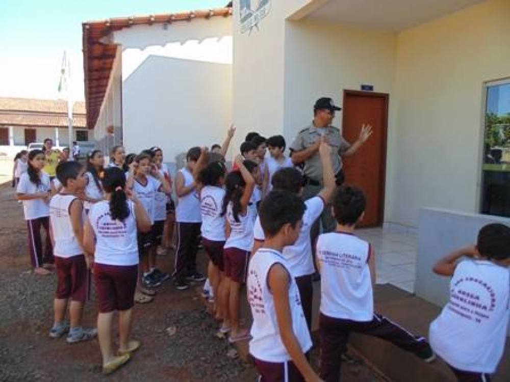 Os alunos da Escola “Nossa Escolinha” visitaram as instalações do quartel, onde funciona a sede da 5ª Companhia Independente da PM. Acompanhados dos professores e pelos instrutores do Programa, os alunos tiveram a oportunidade de conhecer na prática como funciona o Serviço Policial Militar – SPM. Visitaram as diversas seções e o Comando da Companhia, onde puderam esclarecer várias dúvidas de como é o dia-a-dia e a estrutura de atendimentos das ocorrências nas 11 cidades que compõe a 5ª CIPM.