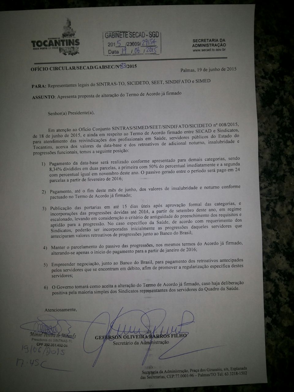 A contraproposta foi recebida pelo presidente do Sintras, Manoel Pereira de Miranda, que informou ao gestor que a mesma será levada para análise e votação em Assembleia Geral que será realizada nesta segunda-feira, 22, às 18hs, na sede central do Sintras em Palmas.