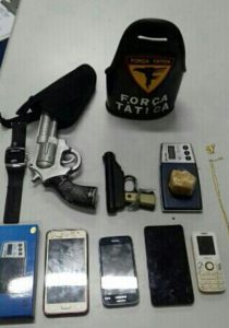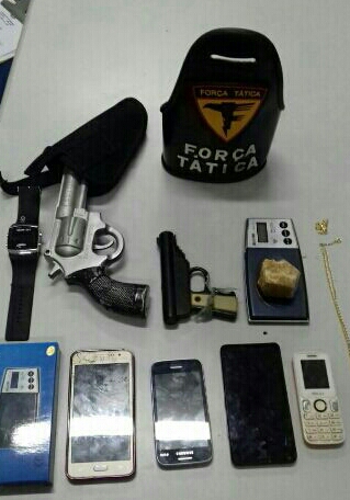 Na residência onde o casal estava os policiais apreenderam uma balança de precisão, uma porção de substancia análoga ao crack com cerca e 58 gramas, um simulacro de arma de fogo de cor prata semelhante a um revólver calibre 38, um simulacro de arma de fogo de cor preta semelhante à pistola bereta, um relógio, uma corrente de cor dourada, quatro aparelhos celulares e uma balança.