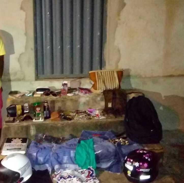 Com os suspeitos havia oito perfumes nacionais e importados, dois óculos de sol, uma carteira de bolso feminina, uma bolsa feminina, cinco shorts jeans femininos, três blusas e três colares femininos. Já na residência em que estavam foram encontrados cinco capacetes, um papelote de maconha, 15 papelotes de crack e o valor de R$ 440 reais em dinheiro.