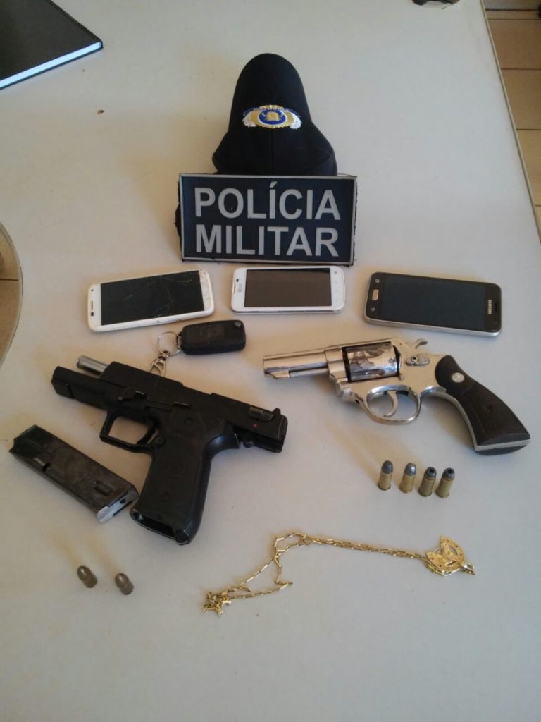 Em seguida, quando averiguavam a situação dos três suspeitos, verificou-se que eles portavam uma pistola calibre 9mm com duas munições e um revólver calibre 38 carregado com quatro munições, em sequência os militares foram informados que acabara de ocorrer um roubo na Agência dos Correios.