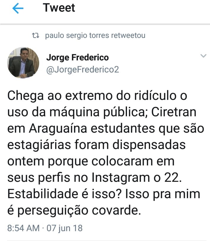 Esta foi a postagem do deputado Jorge Frederico sobre o fato relacionado ao Ciretran de Araguaína: Chega ao extremo do ridículo o uso da máquina pública; Ciretran em Araguaína estudantes que são estagiárias foram dispensadas ontem porque colocaram em seus perfis no Instagram o 22. Estabilidade é isso? Isso pra mim é perseguição covarde.