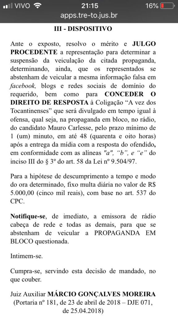 Confira a decisão completa da Justiça clicando aqui: http://apps.tre-to.jus.br/mural/api/906/decisao/pje.