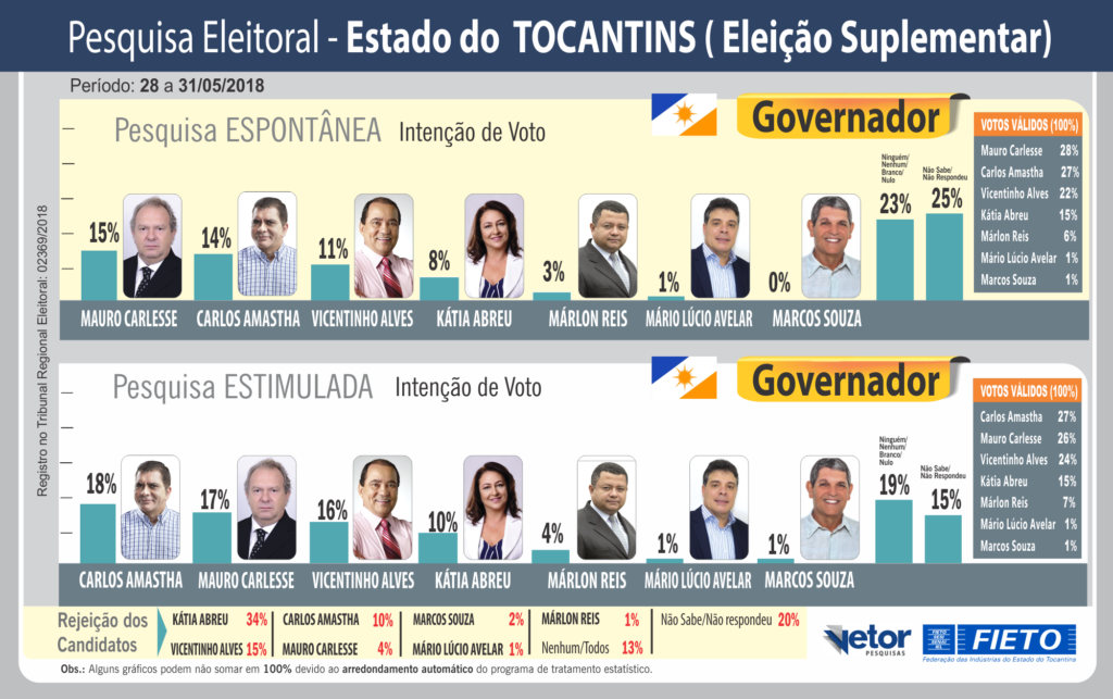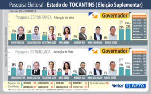 Se a eleição suplementar fosse hoje, segundo a pesquisa, Carlesse teria 15% dos votos válidos, seguido de Carlos Amastha (14%), Vicentinho Alves (11%), Kátia Abreu (8%), Marlon Reis (3%) e Mario Lúcio Avelar (1%). O candidato Marcos Souza não pontuou.