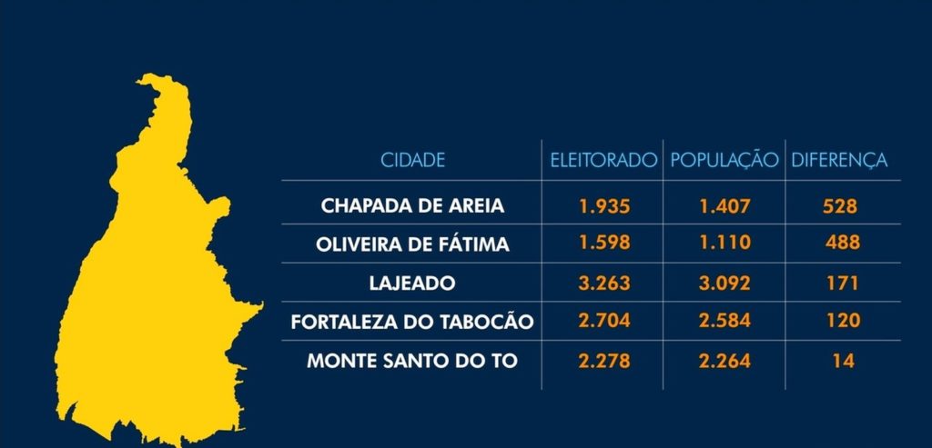Em cinco cidades do Tocantins existem mais eleitores do que habitantes. Um estudo da Confederação Nacional de Municípios revela que Chapada de Areia, localizada na região central do estado, é a cidade que apresenta mais diferença. Lá, são 1.935 eleitores e 1.407 moradores. No próximo domingo, 24, os tocantinenses vão às urnas novamente para o 2º turno da eleição suplementar escolher o governador que comandará o estado até o fim do ano.