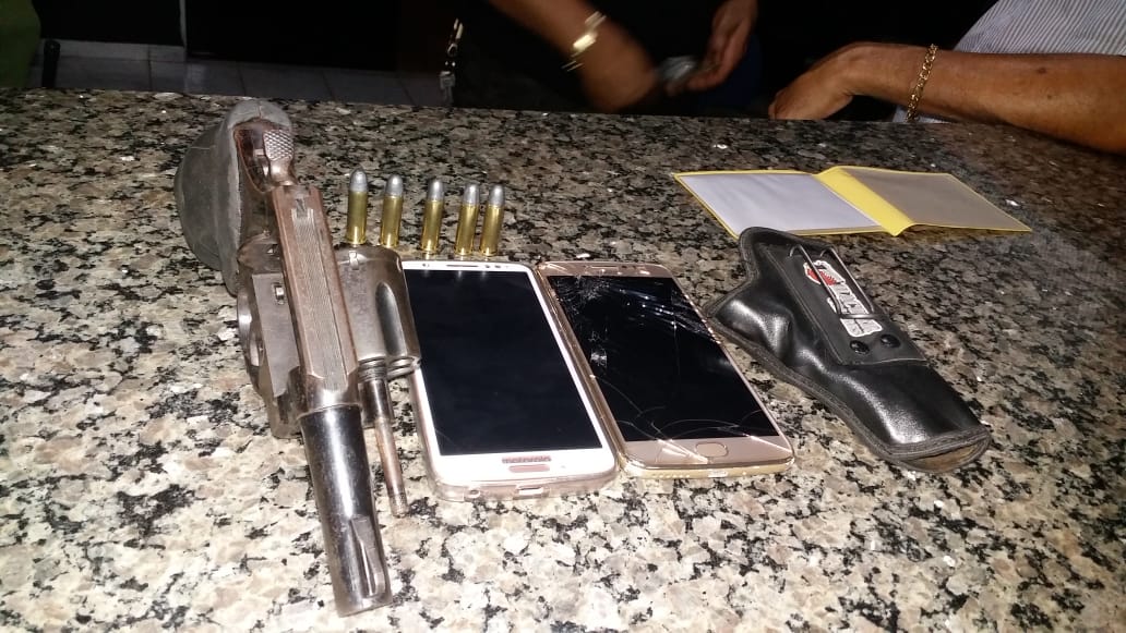 No veículo foi localizada uma arma de fogo tipo revólver, calibre 38, com a numeração raspada e cinco munições intactas na bolsa de bebê. O autor estava com um coldre na cintura e confessou que o revólver é de sua propriedade e repassou o mesmo para sua esposa, que colocou na bolsa.