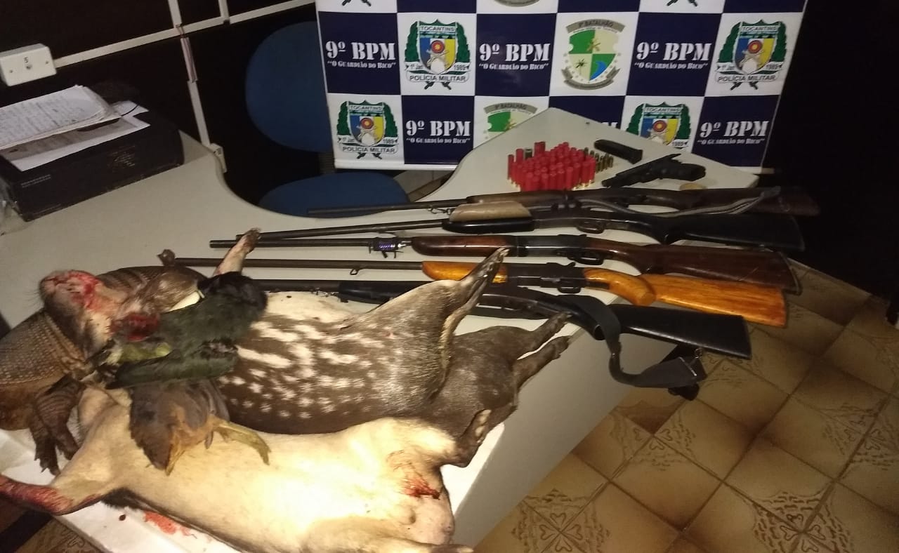 Cinco homens foram detidos pela Polícia Militar durante a noite de sexta-feira, 21, nas proximidades do povoado de Macaúba, município de Araguatins. Todos estavam em camionete Toyota Hilux, placa de João Lisboa (MA). Em poder dos autores, entre 30 e 40 anos de idade, a PM apreendeu cinco espingardas dos calibres, 16, 28 e 32mm; uma pistola .40mm; mais de 70 cartuchos dos mesmos calibres das espingardas apreendidas; dois facões; e ainda seis animais da fauna silvestre abatidos, sendo, três pacas, um tatu, uma jaó e um tucano.