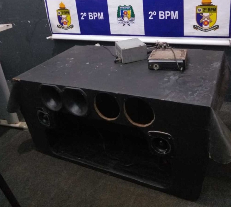 A Polícia Militar apreendeu, no sábado e domingo, 6 e 7, nos setores: Morada do Sol II, Raizal, Universitário, Céu Azul e Monte Sinai, em Araguaína, cinco aparelhagens de som: uma caixa de som com dois alto falantes; uma caixa de som amplificada, marca LG modelo mini system cor preta; uma caixa de som marca Teac, cor preta; uma cixa de som marca system e, uma caixa de som com dois alto falantes, duas corneta, duas twitt, de propriedade de um homem, 22 anos; homem, 20 anos; mulher, 34 anos; mulher, 33 anos e homem, 34anos, respectivamente, a maioria no horário noturno.