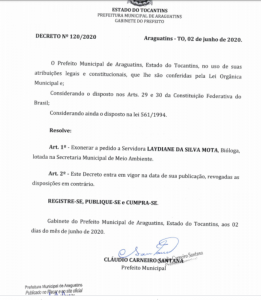 Após o advogado Alday Machado e o ativista e jornalista Wemerson Lima, ingressarem com uma representação na Promotoria de Justiça de Araguatins, no norte do Tocantins, contra a servidora licenciada Laydiane Mota e o prefeito Cláudio Santana por suposta improbidade administrativa, o decreto de nº 120 do dia 2 trouxe exoneração da funcionária.