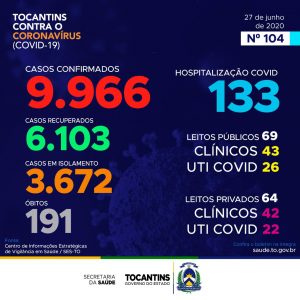 Atualmente, o Tocantins apresenta 9.966 casos no total, destes, 6.103 pacientes estão recuperados, 3.672 pacientes estão ainda em isolamento domiciliar ou hospitalar e 191 pacientes foram a óbito.