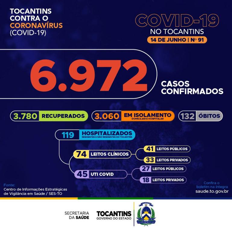 Atualmente, o Tocantins apresenta 6.972 casos no total, destes, 3.780 pacientes estão recuperados, 3.060 pacientes estão ainda em isolamento domiciliar ou hospitalar e 132 pacientes foram a óbito.