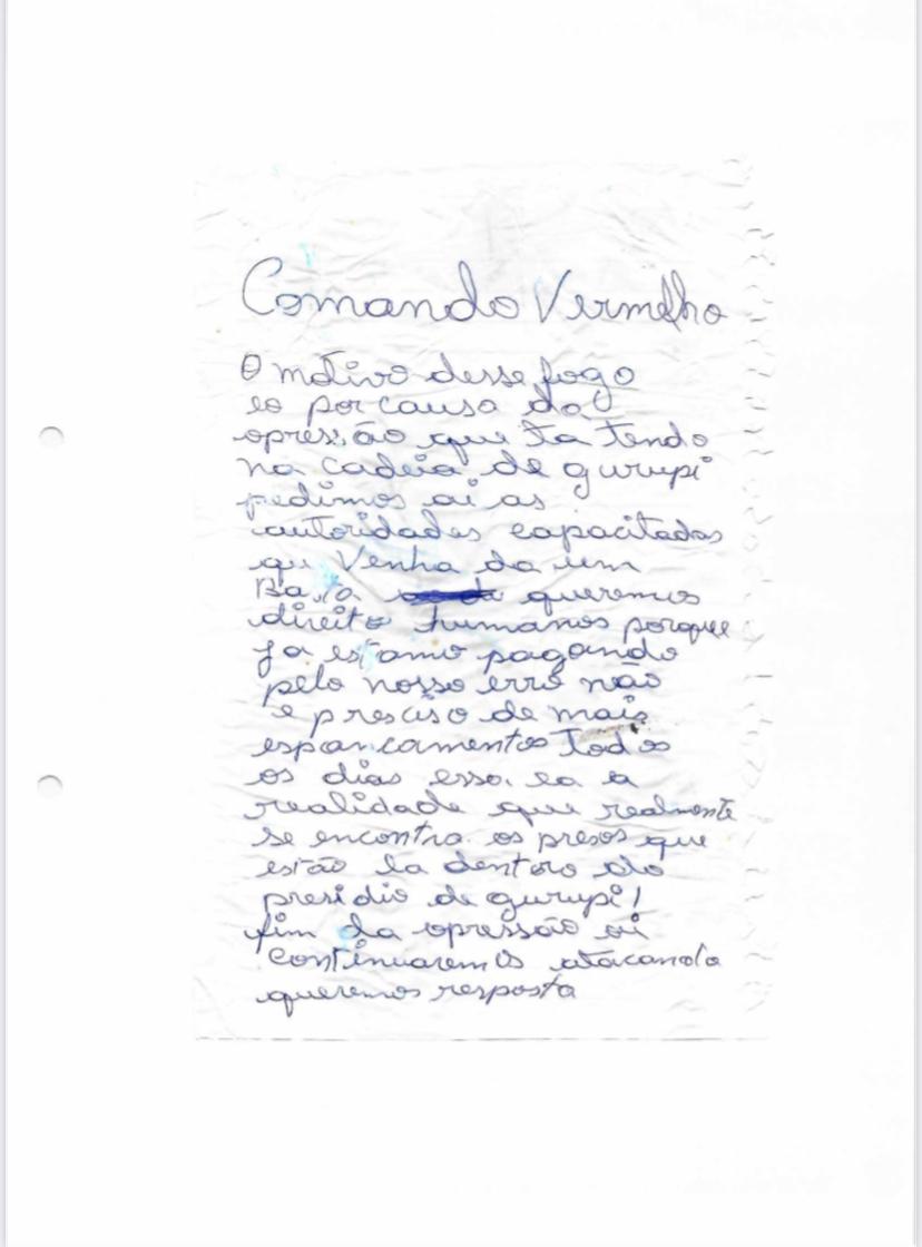 O promotor de Justiça João Edson de Souza lembra que o fato causou apreensão à população do município e ressalta que a prisão é medida que se faz necessária para a garantia da ordem pública, visto que, na carta, os acusados ainda ameaçaram continuar com os ataques.