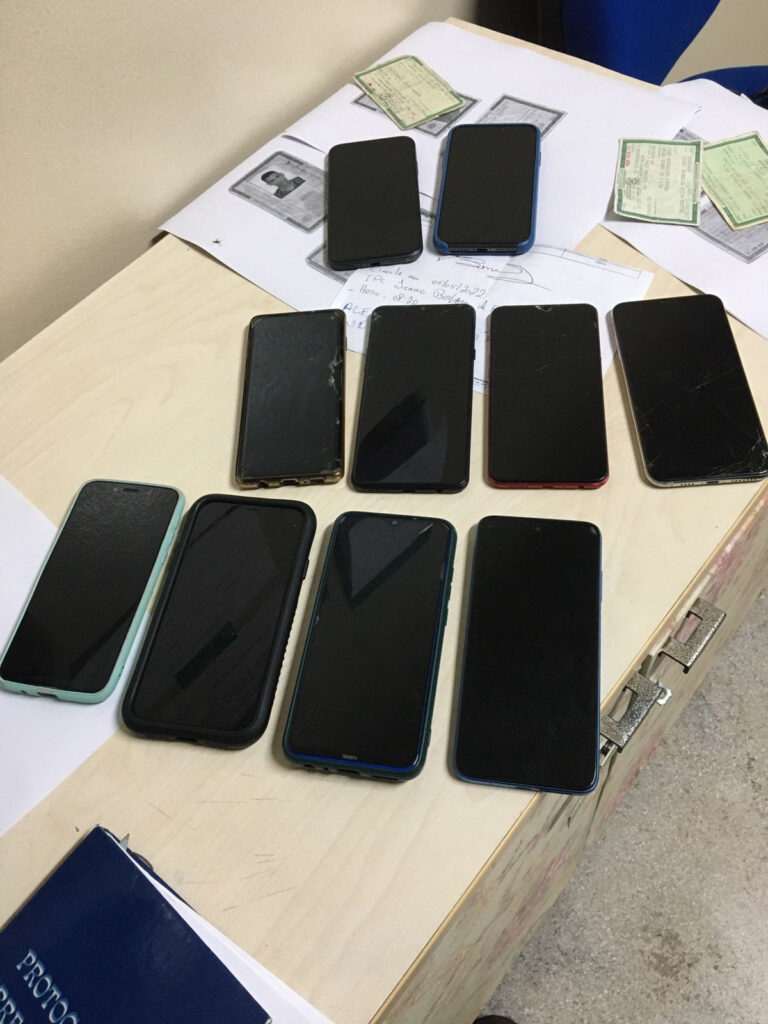 Na oportunidade, também foram apreendidos em poder dos suspeitos, cerca de 10 aparelhos celulares, em sua maioria do modelo Iphone, além de documentos falsos, e um computador programado para redefinição de códigos de identificação para aparelhos celulares.