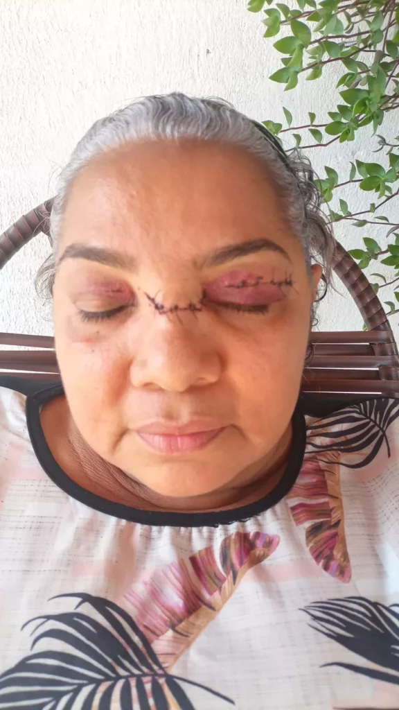 Maria do Rosário conta que percebeu quando algo passou por dentro do capacete, mas não imaginou a gravidade dos ferimentos. “Eu deixo a moto na pista e vou caminhar. Mas quando passei, a viseira estava um pouco aberta, e senti a linha passar pelo meu rosto. Não consegui parar na hora, mas quando parei e tirei o capacete, meu rosto estava ensanguentado”, diz, contando que a linha cortou uma de suas pálpebras e o nariz.