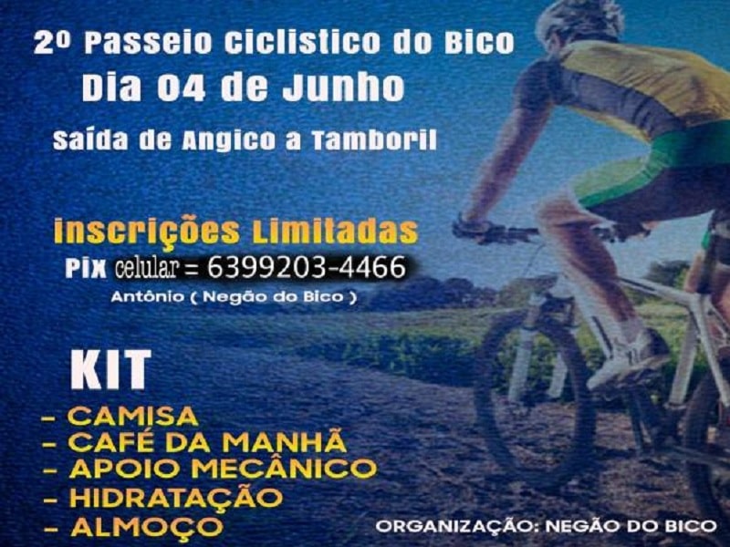 O evento é organizado e idealizado pelo comunicador Negão do Bico, a largada ocorrerá na cidade de Angico com destino ao Povoado Tamboril, a taxa de inscrição custa R$ 50,00, a organização oferecerá água, café da manhã, almoço, apoio mecânico e hidratação; interessados em participar do passeio podem entrar em contato pelo telefone (63) 99203-4466.