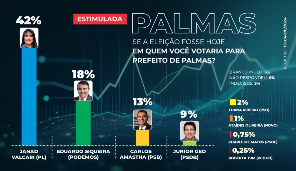 Na pesquisa estimulada, onde os nomes dos candidatos são apresentados aos entrevistados, Janad Valcari lidera com 42% das intenções de voto. A distância de 24 pontos percentuais em relação ao segundo colocado, Eduardo Siqueira, que tem 18%, destaca uma vantagem, seguida pelo ex-prefeito de Palmas, Carlos Amastha (PSB), com 13%. Júnior Geo (PSDB) ocupa a quarta posição com 9%, enquanto Luana Ribeiro (PSD) tem 2% das intenções. Outros candidatos como Ataídes Oliveira (NOVO), Charleide Matos (PSOL) e Roberta Tum (PCdoB) têm, respectivamente, 1%, 0,75% e 0,25% de apoio.